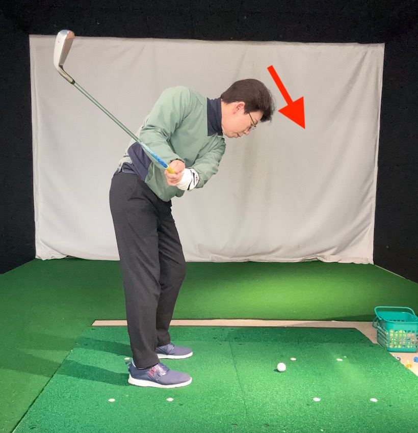 テークバックの際、頭が下がる人もけっこういます。頭が下がると、アドレスしたときよりカラダとボールの距離が近づいてしまうため、うまく当てることが難しくなります。このタイプは“ボールから目を離してはいけない”とか“ボールを凝視する”といった意識が強いようです。インパクト前に顔の向きが変わってしまう“ヘッドアップ的”な動作は避けるべきですが、ゴルフは野球やテニスと違い、ボールが止まっているので凝視しなくても大丈夫。テークバック時、カラダの回転とともに、自然と顔の向きが変わるようにすると頭が下がらなくなるでしょう。