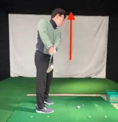 テークバックのとき前傾角度が崩れて、上に伸び上がる人もたくさんいます。こうなると、アドレスしたときよりカラダとボールの距離が離れてしまうため、きちんとミートすることが非常に難しくなります。伸び上がる人はテークバックの際、手でクラブを上に持ち上げる動作が強かったり、大きかったりする傾向が。伸び上がりを抑止するには、カラダの回転でテークバックする意識が大切。また、左腕が大きく曲がったり、右ヒジが曲がり過ぎたりする人もクラブを持ち上げる動きが強い人なので注意しましょう。