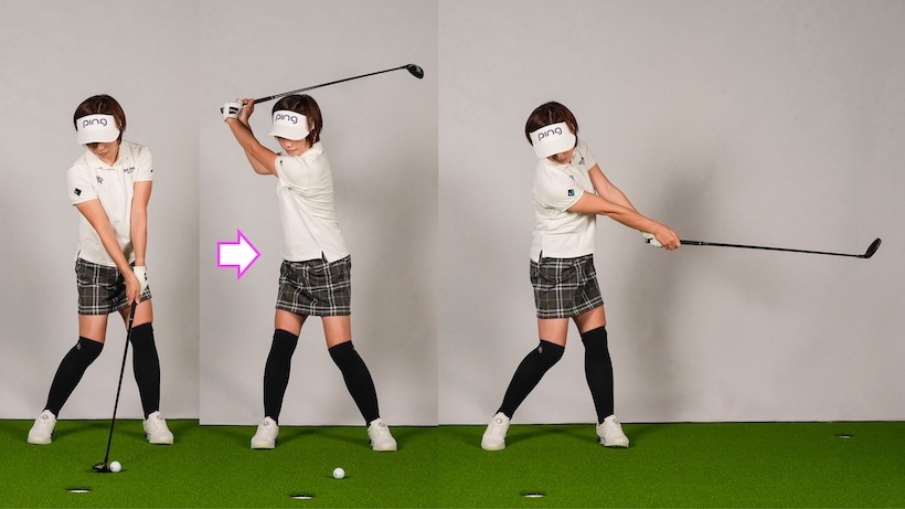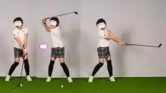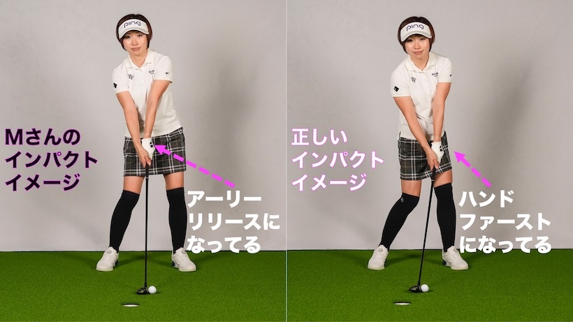 こうするとリリースのタイミングが合ってきます。リリースポイントが早いように感じますが、以前と違って腰が回りだしたMさんにはドンピシャ。以前は絶対にハンドファーストのインパクトになりませんでしたが、腰が回って手元が詰まらなくなり、インパクトがハンドファーストになって結果的に打球が上がりすぎなくなりました。