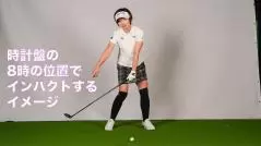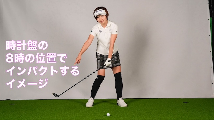 インパクトではアドレス時よりもやや腰が開くので、Mさんに「腰を止めずに回し続けてください」とアドバイスしたところすぐにできましたが、振り遅れてフェースが開いて当たるようになりました。ただ、そうなるのは織り込み済みだったので、体の右サイドでインパクトするイメージをもっていただきました。アドレス時のクラブヘッドの位置が時計の文字盤でいう6時だとしたら、8時のところでインパクトするイメージでスイングしていただいたのです。