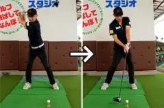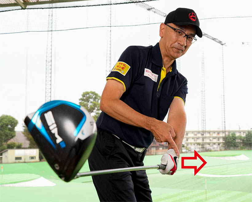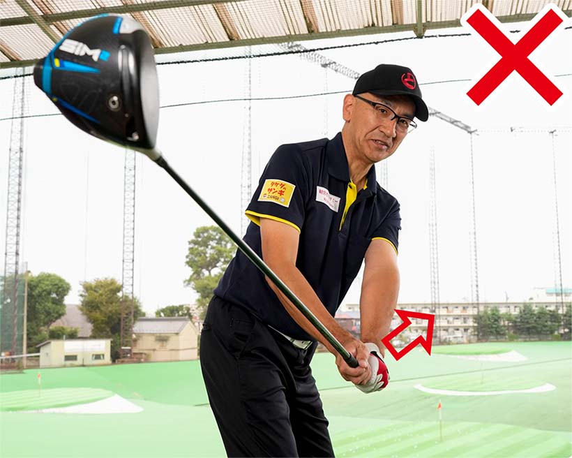 腕振りは縦の動きで、カラダの回転は横の動き。そしてスイングは縦と横の複合動作という考えもありますが、腕を縦の動きととらえてしまうとハーフウェイバックのポジションで左手の甲が斜め上を向き、トップでは左手首が甲側に折れてフェースが開いてしまうことになります。そのままで振り下ろすとインパクトでもフェースが大きく開き、ボールは右にしか飛びません。
