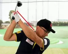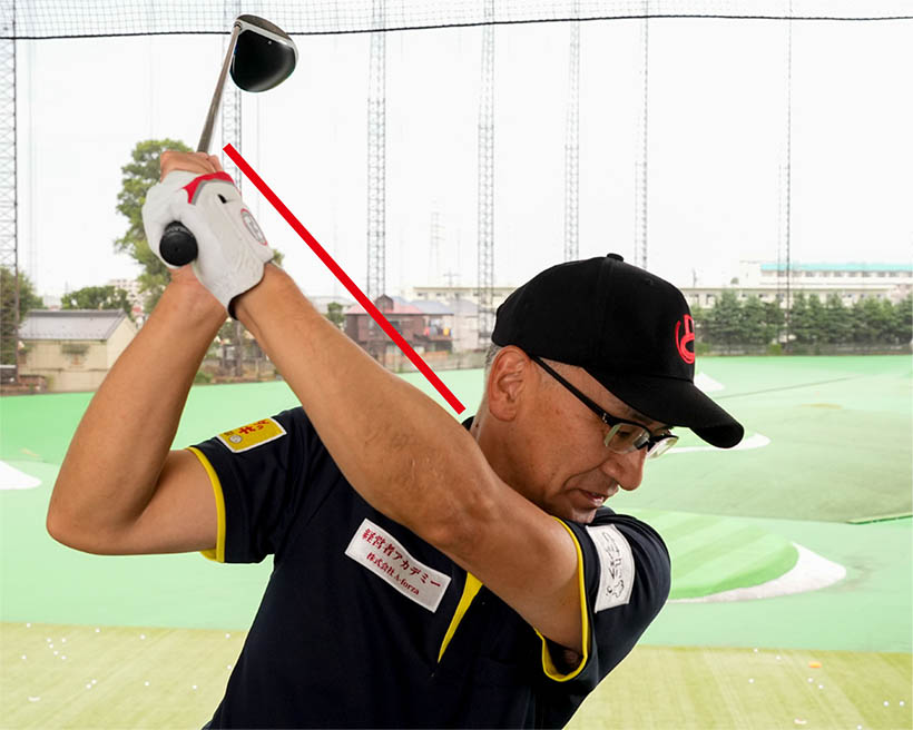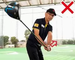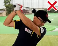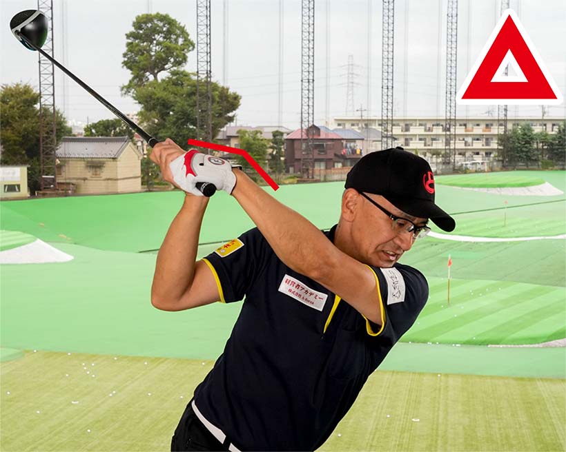 それとは反対にヒンジコックを使いすぎるのもよくありません。プロたちはヒンジコックによってフェースをシャット気味に上げて、左手首を手のヒラ側に折り曲げるレイドオフ型のトップを作る傾向が多く見られます。