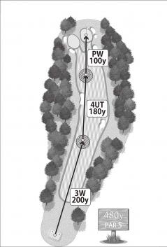 仮に50ヤードのアプローチよりもPWの100ヤードのほうが自信を持てる人なら、ピンから逆算して3打目をPWで打つ。するとティショットと2打目は合わせて380ヤード打てばいいことに。ドライバーと7番アイアンをつないでもよし、UTが得意ならUTを2回使ってもよし。そう考えればティショットを無理に飛ばさなくてもいいことがわかります。