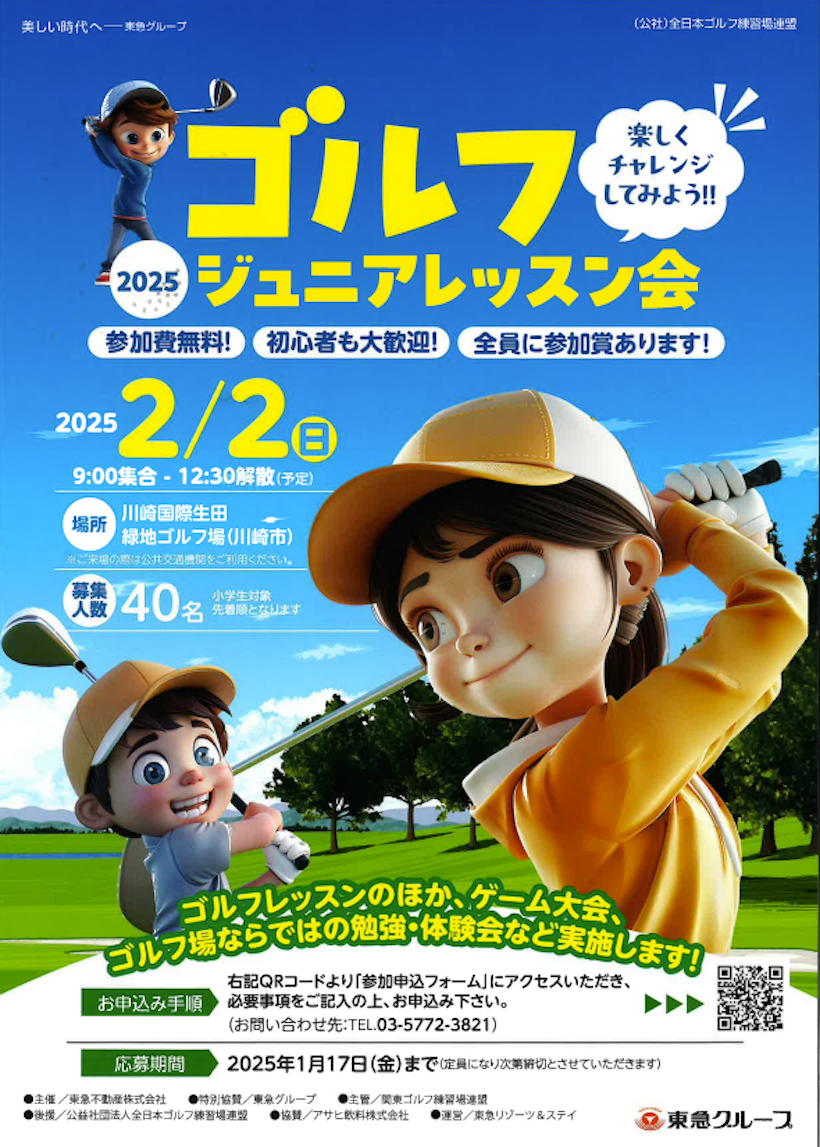 都心からのアクセスが良い多摩丘陵にある生田緑地の自然を生かした「川崎国際生田緑地ゴルフ場」にて、小学生を対象とした参加費無料の「ゴルフジュニアレッスン会」が2025 年2月2日(日)に開催される。