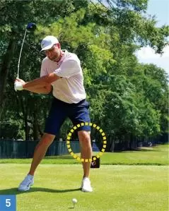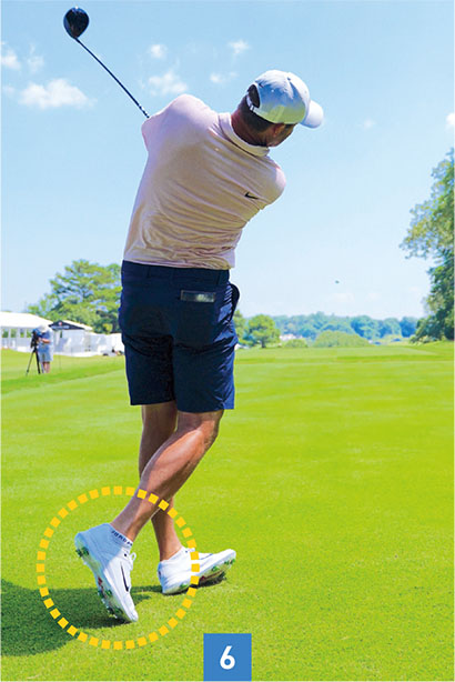 シェフラーのスイングと言えば、インパクトからフォローにかけて右足を後ろに引く動きが最大の特徴です(写真05写真06)。これは意識的に「右足を引こう」と思ってやっているわけではなくて、スイング中に起こる受動的な動きといえます。このポイントだけをマネするのはオススメしません。