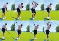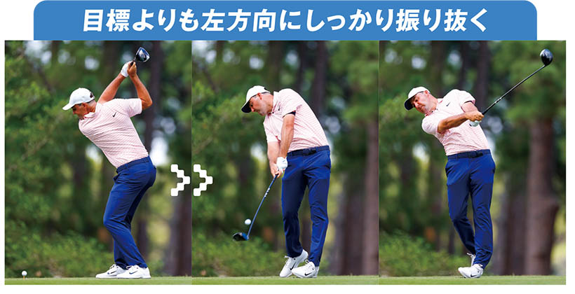 インパクト以降は上半身がやや右に傾いていますが、右に傾くことによって打ち出し角を高くしています。アマチュアは上半身が傾くとダフリのミスが出やすいのですが、それは右足に体重が残っているからです。シェフラーのように早いタイミングで左足体重になれば、高弾道のフェードボールが打てます。