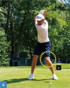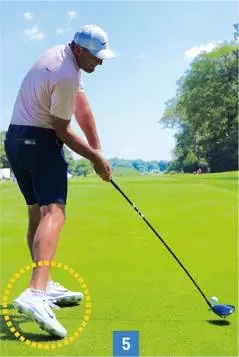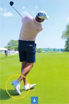 左ヒザの動きに注目するとトップでは少し内側に入っていたのが、切り返し直後は左側に動いています。左ヒザの動きによってシェフラーはヨコ方向に力を入れるタイミングをとっていると思います。インパクト以降では左足がめくれるような動きになっていますが、これがヨコ方向に力を使う選手の特徴です(写真06写真07)。タテ方向の力を使うタイプの選手だと左足がツマ先立ちになっていたり、ジャンプしているような姿勢になります。