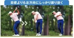 シェフラーは典型的なフェードヒッターです。フェードヒッターはダウンスイングでアウトサイド・イン軌道でクラブを動かしたい。そのとき気をつけないといけないのが、右腰・右足が前に出ること。右サイドが前に出ると、クラブの通り道がなくなるので窮屈なスイングになってしまいます。