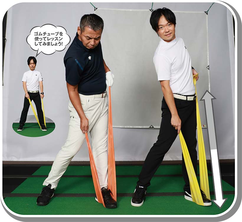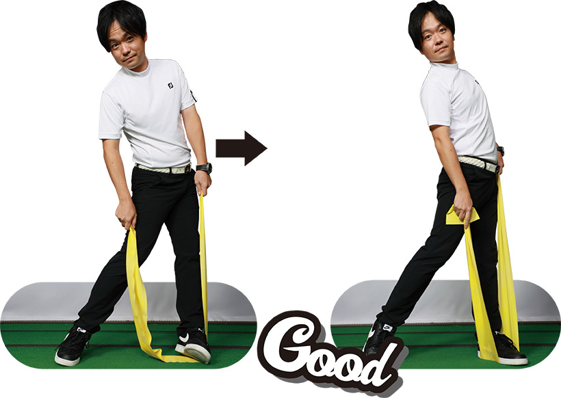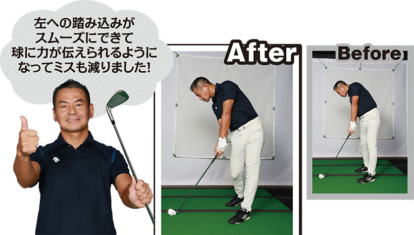 (写真右)カカトに圧がかかることで、身体の回転がスムーズになり、力の伝わるインパクトになる