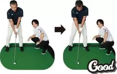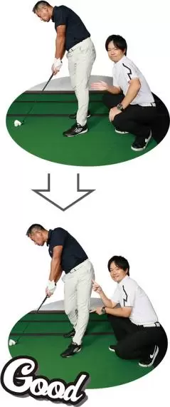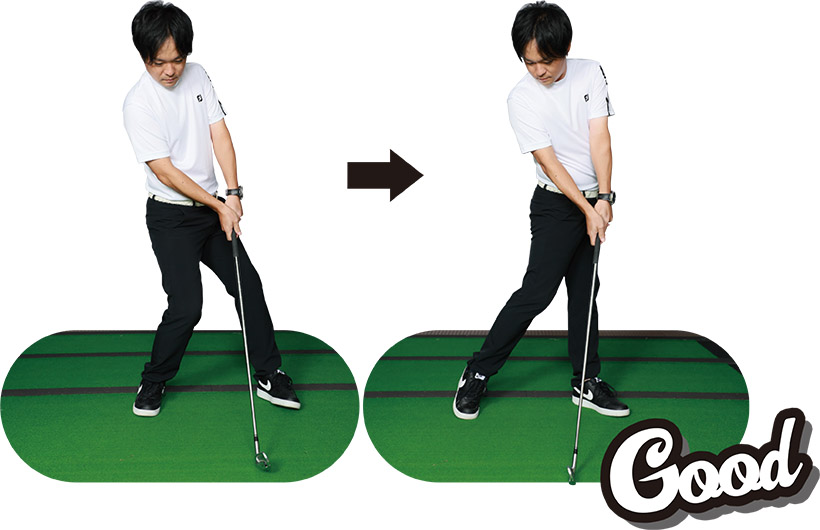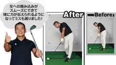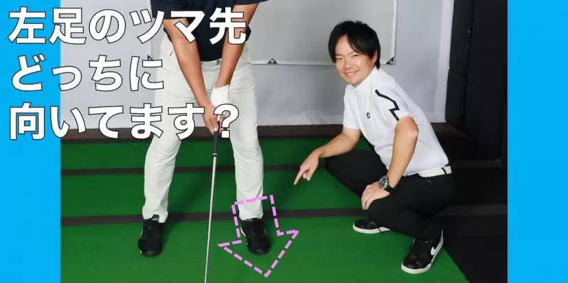 そもそもアドレスで左のツマ先が閉じ気味なことで下半身が動かしにくくなっており、切り返し後、左足が邪魔をして身体の回転を止めてしまっていた