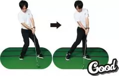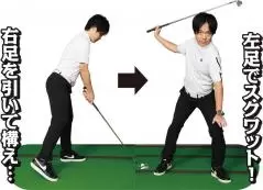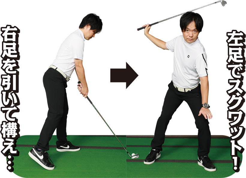左足にしっかり重心を乗せるドリルです。右足を少し後方に引いてカカトを浮かせます。左足1本で立っている感覚でスイングし、ダウンと同時に左ヒザを曲げてスクワットをしてみましょう。左足裏に体重をグッと乗せて、その反動を使ってタイミングよく足を伸ばしてスイングします。