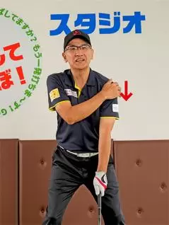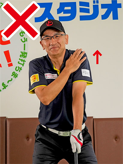 いかり肩になるのは力んでいる証拠。上体をラクにして、なで肩に構えよう
