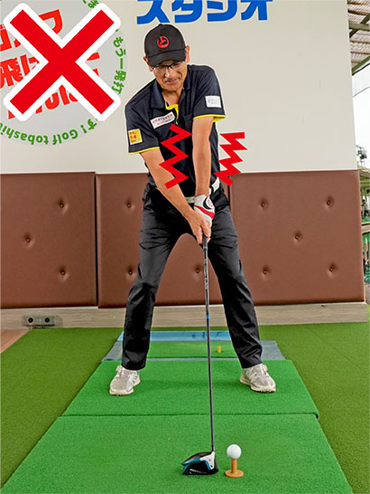 典型的なパターンが、両ヒジが伸びて、いかり肩となった姿勢です。こんなときは知らず知らずのうちにグリップを強く握りすぎています。とくに左肩が浮いて左ヒジが突っ張るとバックスイングで左肩が回転しにくく、飛ばしに欠かせないカラダの捻転が浅くなってしまいます。
