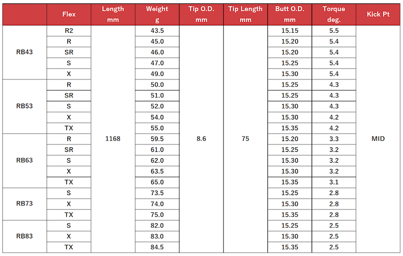 ディアマナRBは、カタログ表記上ではMid、いわゆる中調子になっていますが、他のシャフトと比較すると、きわきわの先端が最も剛性を下げた設計になっており、赤系の特性をしっかりと継承しています。スペックは、40g台、R2からXの5種、50台、RからTXの5種、60g台、RからTXの5種、70g台、SからTXの3種、80g台、SからTXの3種と非常に豊富なラインアップ。特に80g台は、ラインアップしているメーカーが減っており、ドライバーとフェアウェイウッドのシャフトを統一したいゴルファーにとってはありがたいですね。