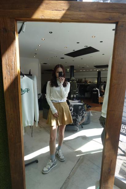 まず一番にわたしの目が飛びついたのがこちら。白のモックネックに、ベージュのスカートを合わせた女性らしいコーデ。