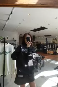 ミニスカートにユニセックスのトレーナーをダボっと着るシンプルなスタイルが、完全に「モテ」のそれ。トレーナーのバックデザインもかわいい。