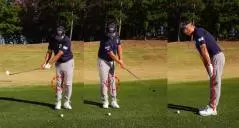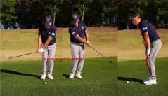 ショットとアプローチの違いがどこにあるかといえば、体に対して手元が大きく動くかどうか。ショットでは手元が動きますが、アプローチでは手が常に体の正面にあり、短い距離を打つと時ほどそうなります。