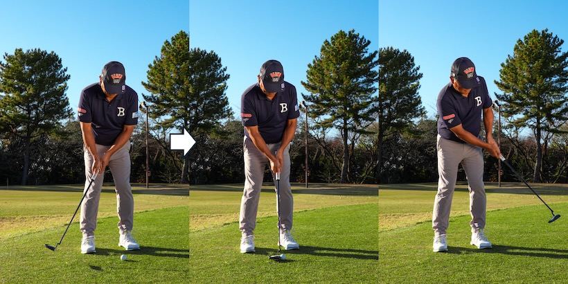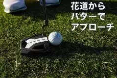 というわけで、左足上がりの花道から寄せる場合に最も安全・確実なのはパターを使うことです。パターで打てばヘッドが極端に上から入ることはないし、振り幅の大きさやインパクトの強さで距離をコントロールできます。グリーンまで距離がある状況では寄せるのが難しいかもしれませんが、ウェッジでチャックリして乗らないよりずっといい。パットの練習にもなるでしょう。