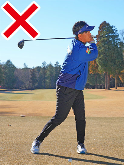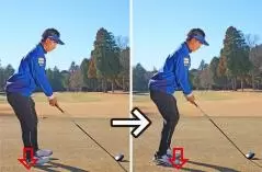 自分では土台を安定させたつもりでも、実際は足がしっかり地についていないため、スイング中に下半身のバランスが保てず、スイング軌道が安定しにくい上にフィニッシュまでしっかりと振り切れません。