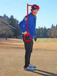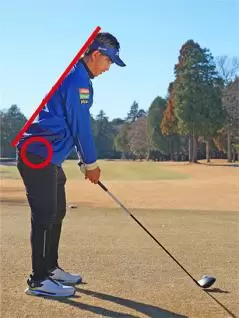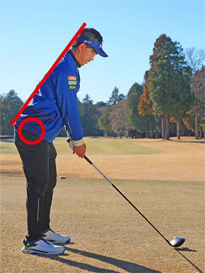 重心がカカトやツマ先に寄りすぎたり、上体の前傾角度が浅すぎたり深すぎたりしてはこのラインは歪んでしまいます。どうも下半身のどっしり感が感じられないと思ったら、アドレスの姿勢を鏡などに映してチェックしてください。