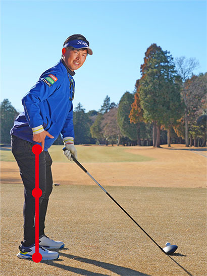 飛ばせるアドレスの目安として、飛球線の後方側から見たときに腰骨(股関節の前側)、ヒザ頭、土踏まずを結ぶラインが一直線となるように構えましょう。