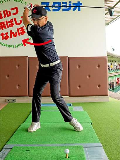 連続素振りのようにスイングのスタート地点をフォロースルーに持っていけば、自然に下半身リードでバックスイングできるようになります。