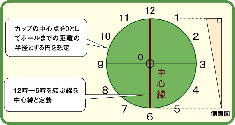 3時と9時、カップの真横から打つ場合の力加減を「1」とした場合、上りのラインである6時のときは「4/3」、12時からのときは「2/3」。
