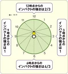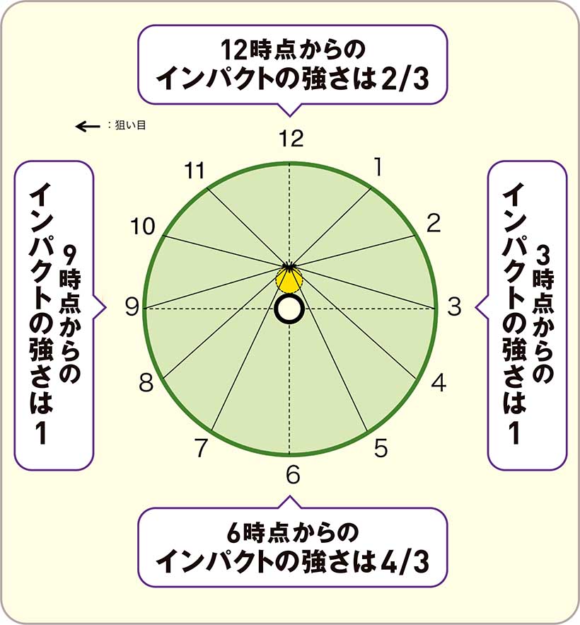 清永 はい! どこからでも入れてスコアアップに役立ててください。まず、真横からのライン、文字盤でいう3時と9時から狙うときの力加減を「1」としましょう。そうすると12時から打つ場合はインパクトの強さが「2/3」になります。逆に6時から打つ場合、インパクトの強さは「4/3」になります。