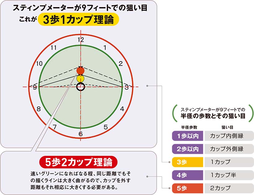 清永 スティンプメーターで測ったグリーンの速さが9フィート、まあゴルフ場の通常営業の速さと考えていただければいいでしょう。この速さのグリーンで9フィートですから、だいたい歩幅3歩前後のタッチの力加減です。