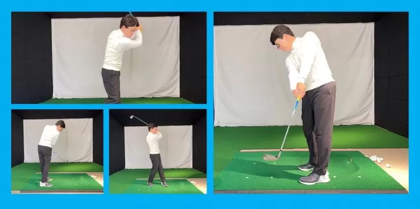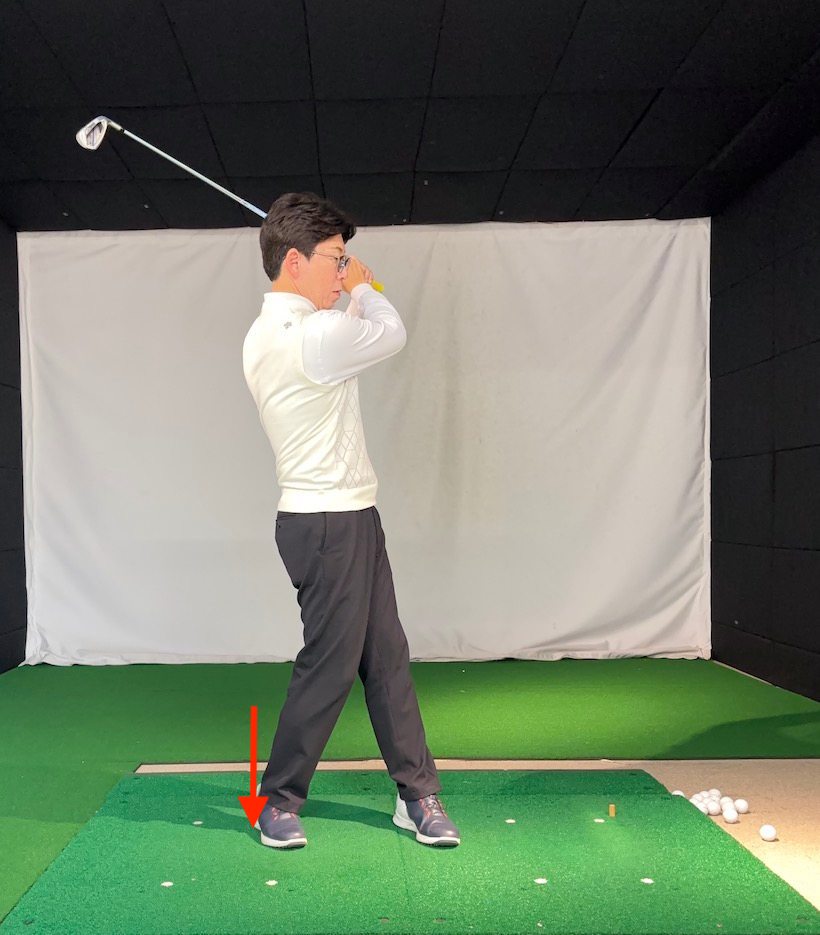 フィニッシュで体重が右足に残ってしまう人もよく見かけます。すべて…というわけではありませんが、このタイプはカラダを回転させることばかりにとらわれていたり、右足が回転軸になっている人が多いものです。右足に体重が残るフィニッシュを修正するには、切り返しで左足をグッと踏み込んでまずは体重を左足へ移動し、その後、カラダを回転させるようにしましょう。