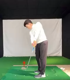 インパクト後、すぐにグリップがお腹の陰に隠れてしまう人はとても多いもの。こうなると前項同様、フェースターンがきちんと発生せず、ボールのつかまりが悪くなったり、擦ったインパクトになってスライス弾道になったりすることがとても増えてしまいます。手元(グリップ)を左へ引き込むようなフォロースルーを修正するには、インパクト後、すぐにヘッドが手元を追い越していくイメージをもちましょう。また、ヘッドをややアウトサイド方向に振り抜いていくイメージも効果的です。