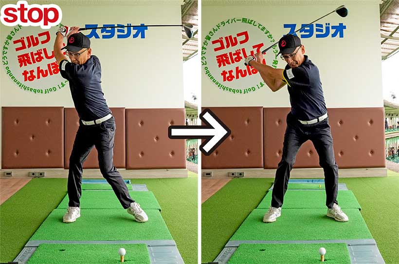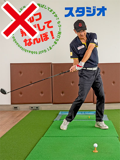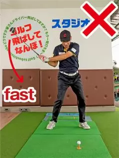 バックスイングが速すぎるとカラダが十分に捻転しないうちにダウンスイングに向かうから、カラダが早く開いて突っ込み打ちになりやすい。