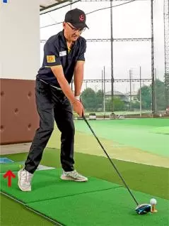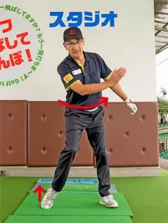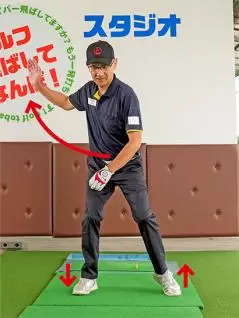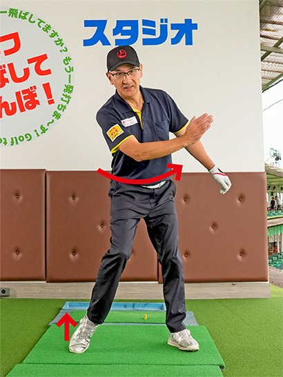 ではどうすればいいかというと、反動を利用してカラダを回転するのが一番です。私は「足踏み感覚」をいつも説明していますが、これは左カカトを浮かせて腕を右に振り、右カカトを浮かせて腕を左に振るのが基本動作です。