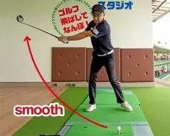 これで肩もスムーズに回転し、カラダと腕が連動します。その流れでバックスイングすれば速すぎずゆっくりすぎず、適切なスピード感覚でトップへと上げていけます。