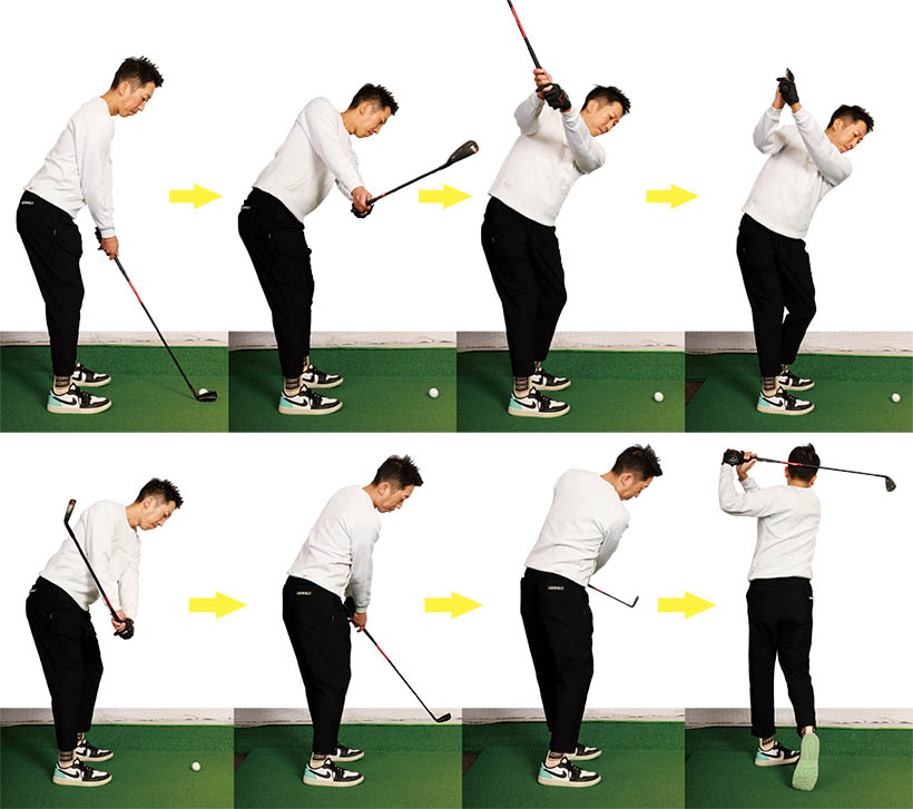 始動でいきなり手元だけを高く上げてしまい右ヒジがうまく畳めていないため、バックスイング中にコックが始まりトップで余分な手首の動きが入ってスイングの安定性を欠いていた!