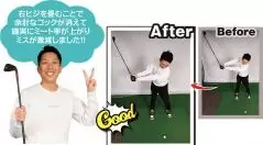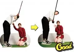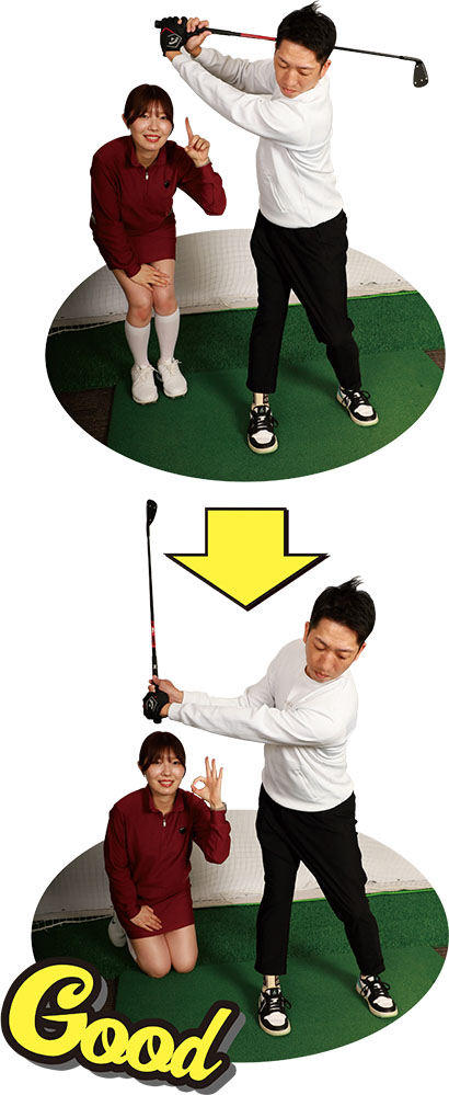 (写真右)クラブが水平くらいまで左手の「L」を離さない!