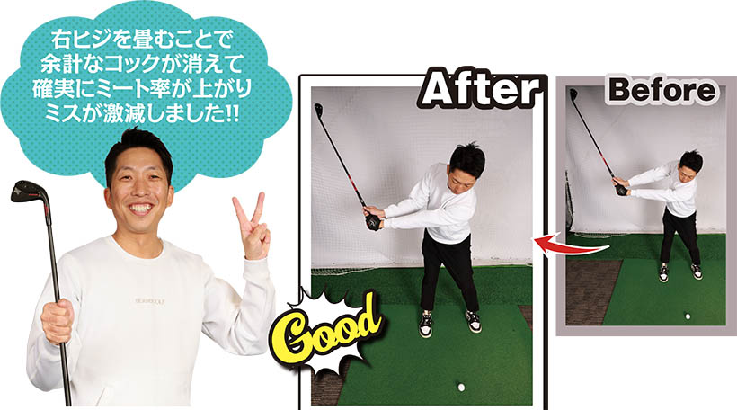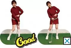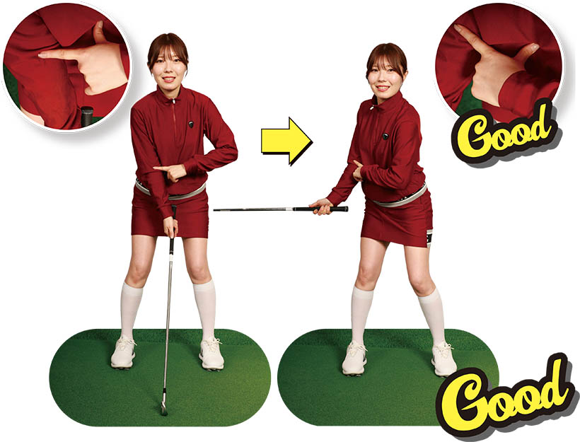 (写真左)アドレスでみぞおちと右腕の距離感を確認!