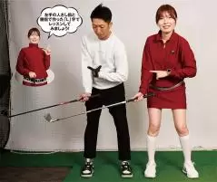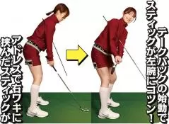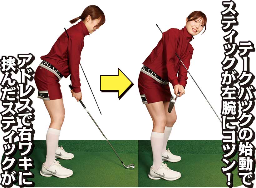 上体と腕を連動させるにはこの方法も。アドレスで右ワキにスティックを挟む。この時点でスティックは右ワキにしか触れていませんが、スイングを始動すると左腕にコツンと当たります。当たった状態をキープしてテークバック。この感覚をしっかり覚えましょう!