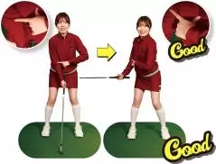 「L」字の親指 をみぞおちに人さし指 を右腕につけてバックスイングしてみましょう!