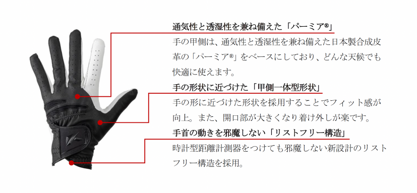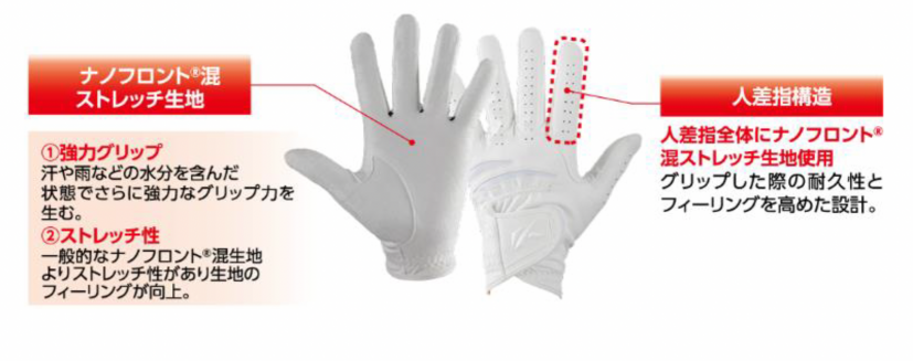 本製品は、帝人フロンティア株式会社が開発した超極細ポリエステルファイバー「ナノフロント®」を編み込んだ「ナノフロント®混ストレッチ生地」を使用。生地表面の微細な凹凸が大きな摩擦力を発生し、且つ、雨や汗などの水分を含んだ状態では、さらに強力なグリップ力を生み出す。