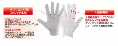 また、一般的なナノフロント®混のニット生地に比べて生地の伸びを良くすることで、手の握る動作にしっかりフィット。柔らかく、快適な着け心地を発揮する。