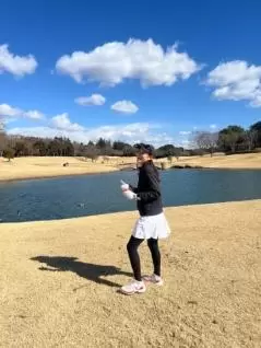 アディダスゴルフ25ssの黒のトップスと白のスカートを合わせ、寒さ対策で黒タイツを着用。