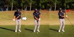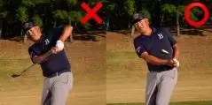 フォローで左ヒジが抜けるとボールがフェースの上を滑ります。当たりが薄いのでヘッドの重さが乗らないためボールが押せません。こうなる主因はテークバックでクラブだけローテーションさせて体が回っていないこと。体が止まるので、左ヒジを抜かないとヘッドが前に出ていかないのです。体が邪魔をすることの代償動作がヒジを抜く動作というわけですね。