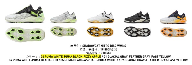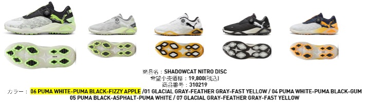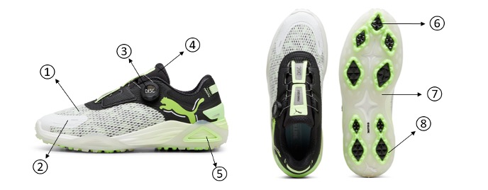 アウトソールはプーマのロゴであるピューマからインスピレーションを受けた猫の目の形をしたCAT-EYE TRACTION(キャットアイ トラクション)が特徴的で、スイング時の体重移動を考慮して配置されたCAT-EYE TRACTION(キャットアイ トラクション)中心部がより硬度のある樹脂となり、外側は柔軟性のある樹脂を使用することで、強力に地面をグリップする。