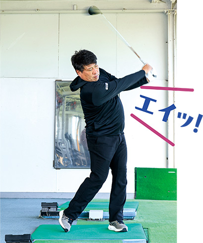 そして、もうひとつ付け加えたいポイントがあります。それは腹圧を入れてインパクトすることです。エイッとかヤーッなど何でもいいですから、腹から大きな声を出して打つ練習は飛ばしに大きく役立ちますし、プロや練習生たちもたくさん取り入れています。