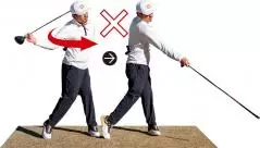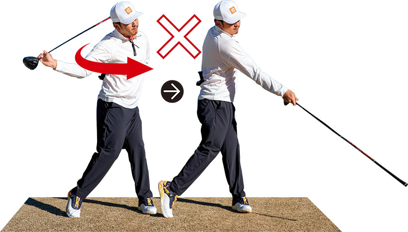 たとえば両手でクラブを持って素振りをするとしましょう。右手でクラブヘッド側を持って速く振る練習でもいいです。ほとんどの人はカラダを回すことや足を使うことに意識がいって、腕やクラブをスムーズに振れていません。とくに足を中心とした下半身をどんどん使い出すと、腕を振るという感覚が失われやすいのです。