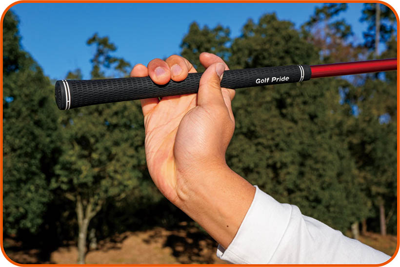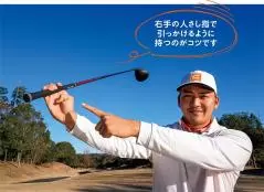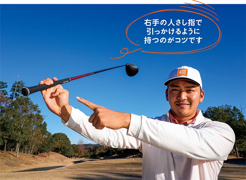 また腕を速く振るには、リストを柔軟に使うことも大事なポイントです。右手は人さし指でグリップを引っかけるように持つのがコツです。右手のヒラでガッチリと握ると、手首が硬くなって腕を速く振れません。指先で持つという感じでグリップすれば、手首が使いやすくなります。