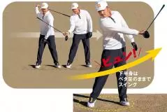 下半身はヘッドスピードを上げるためのサポート役でもありますが、腕と手が主であるべきで、下半身はオプションにすぎないのです。素振り練習をするなら、ベタ足のままで腕を速く振ることにポイントを置きましょう。それを頭に入れておいていただければ、次に説明する切り返しの引っ張り合いで飛ばすということが理解しやすいでしょう。