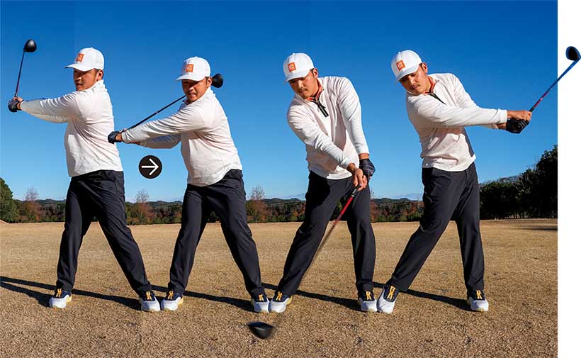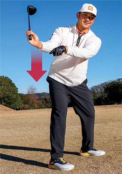 左足を踏み込んでから振り下ろす体勢を作るとか、下半身の意識は不要です。それではクラブが遅れて、速く振れなくなります。とにかく腕と手を真下に引き下ろしましょう。結果として下半身が自然と踏ん張るような動きとなります。プロたちは下半身先行で切り返しているように見えるかもしれませんが、実際は手で振り下ろしているのです。ボク自身も下半身を使う意識はまったくありません。