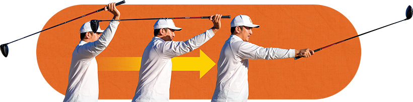 トップというポジションを自分で作ろうとしたり、カタチを意識したりするのはよくありません。スイングには流れというものがあり、カタチを作ろうとすると運動の連鎖がなくなってしまいます。ラームのようにクラブが上に向かう途中でクラブを素早く引き下ろしましょう。これで上に向かう力と下に向かう力が拮抗して、勝手にトップに見えるポジションへとクラブは導かれます。でも、その段階ですでにダウンスイングに入っていて、上と下のパワーの引っ張り合いによって大きなタメとシャフトのしなりを引き出してくれるのです。